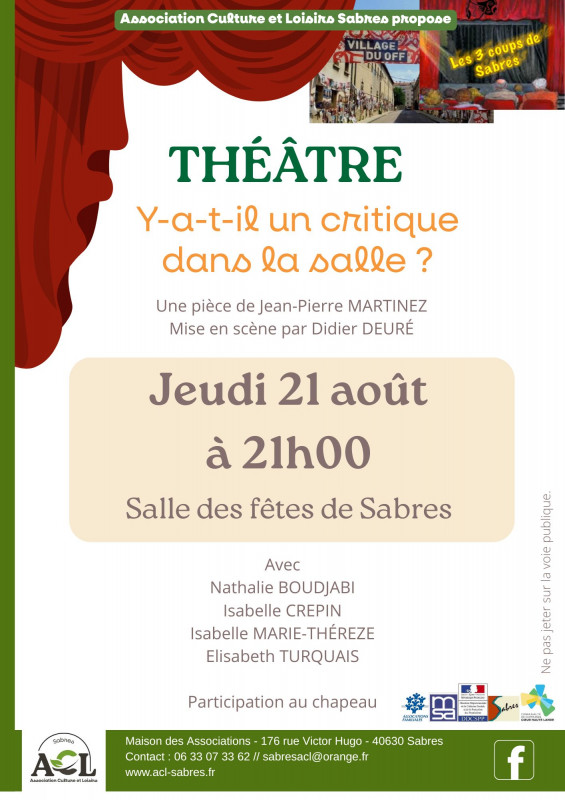 A Sabres, les adultes peuvent participer à une troupe de théâtre amateur, locale et préparer chaque année une pièce avec l'accompagnement de Didier Deuré à la mise en scène.